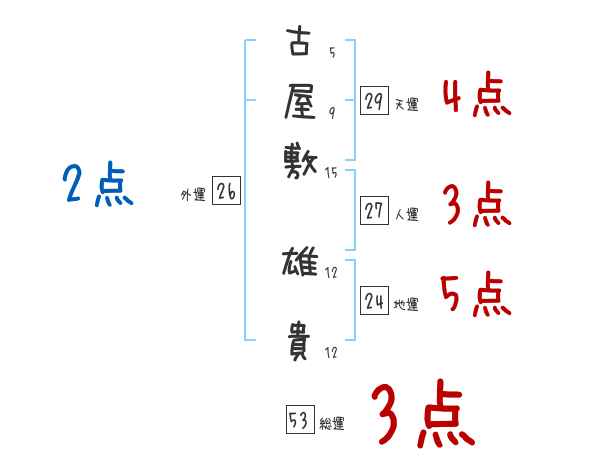 総運![]() | 古屋敷雄貴さんの総運は53画の3つ星!やや見栄っ張りで虚栄心がある。散財に注意。 あなたの人生を表す1番重要な運勢です。生涯を通じて影響する総合運となり、主に50歳以降の晩年期に影響を及ぼします。 |