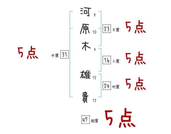 人運![]() | 河原木雄貴さんの人運は16画の5つ星!人望が厚く大きく発展する。逆転成功が見える。 性格や才能などを表す2番目に重要な運勢です。人間関係や協調性、社会的な成功に影響します。主に20歳から50歳ぐらいまでの中年期の運勢を表します。 |