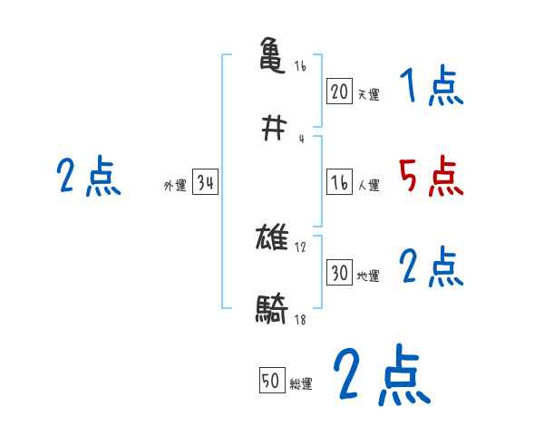 人運![]() | 亀井雄騎さんの人運は16画の5つ星!人望が厚く大きく発展する。逆転成功が見える。 性格や才能などを表す2番目に重要な運勢です。人間関係や協調性、社会的な成功に影響します。主に20歳から50歳ぐらいまでの中年期の運勢を表します。 |