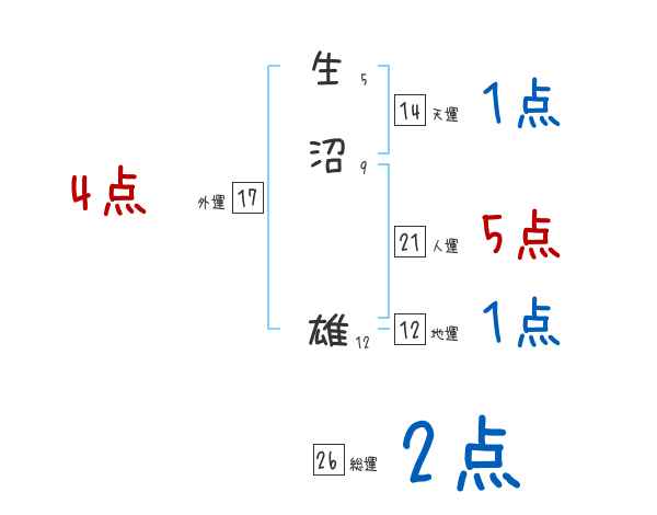 総運![]() | 生沼雄さんの総運は26画の2つ星!波瀾万丈かも。信頼できる人を大事にしましょう。 あなたの人生を表す1番重要な運勢です。生涯を通じて影響する総合運となり、主に50歳以降の晩年期に影響を及ぼします。 |