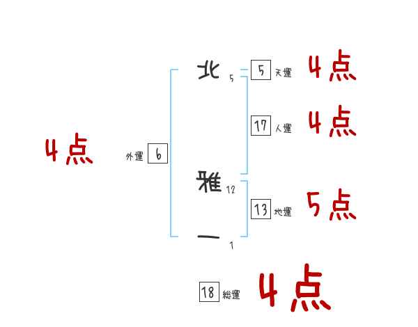 天運![]() | 北雅一さんの天運は5画の4つ星!健康で安泰。協調性に優れ、財産に恵まれる。 家系が持つ宿命的な運勢を表します。祖先から受け継いだ苗字ですので自分の力が及びません。家柄を象徴します。 |