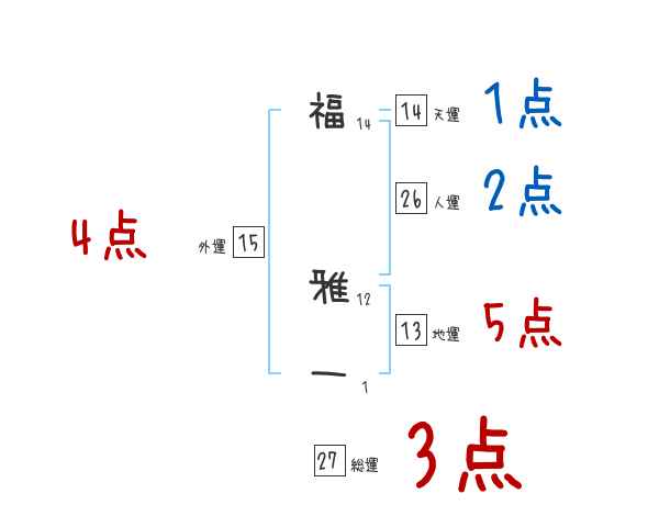 外運![]() | 福雅一さんの外運は15画の4つ星!人徳があり出世する。順調に物事を進め円満な人生。 生活面を象徴する運勢です。外部から受ける影響力を表し、結婚運、家庭運や職場、環境への順応性を表します。 |