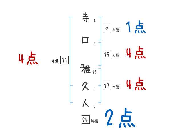 天運![]() | 寺口雅久人さんの天運は9画の1つ星!消極的で才能を発揮することが苦手なことも。周りの意見に耳を傾けましょう。 家系が持つ宿命的な運勢を表します。祖先から受け継いだ苗字ですので自分の力が及びません。家柄を象徴します。 |