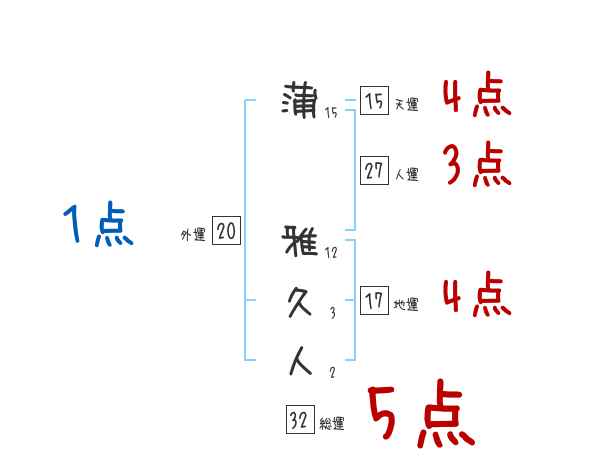 総運![]() | 蒲雅久人さんの総運は32画の5つ星!柔軟性があり成功する。チャンスが多く金運が良い。 あなたの人生を表す1番重要な運勢です。生涯を通じて影響する総合運となり、主に50歳以降の晩年期に影響を及ぼします。 |
