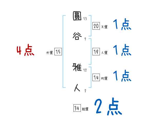 総運![]() | 圓谷雅人さんの総運は34画の2つ星!独創性に優れるが、自尊心が強く災難に注意しましょう。 あなたの人生を表す1番重要な運勢です。生涯を通じて影響する総合運となり、主に50歳以降の晩年期に影響を及ぼします。 |