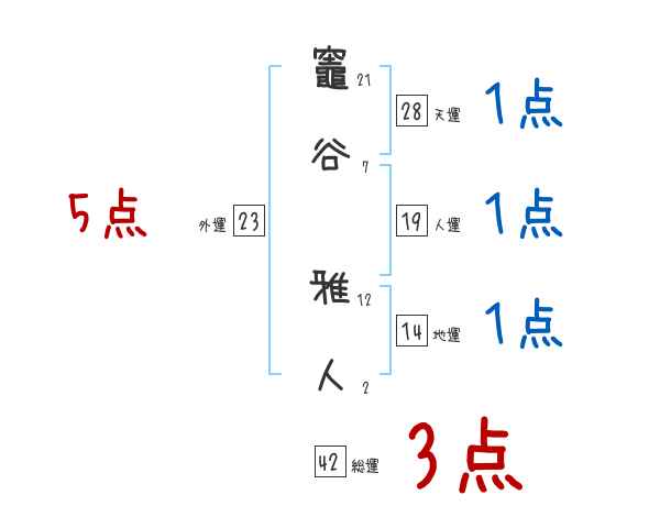 天運![]() | 竈谷雅人さんの天運は28画の1つ星!家庭環境に注意。スポーツで活躍できる能力があるかも。 家系が持つ宿命的な運勢を表します。祖先から受け継いだ苗字ですので自分の力が及びません。家柄を象徴します。 |