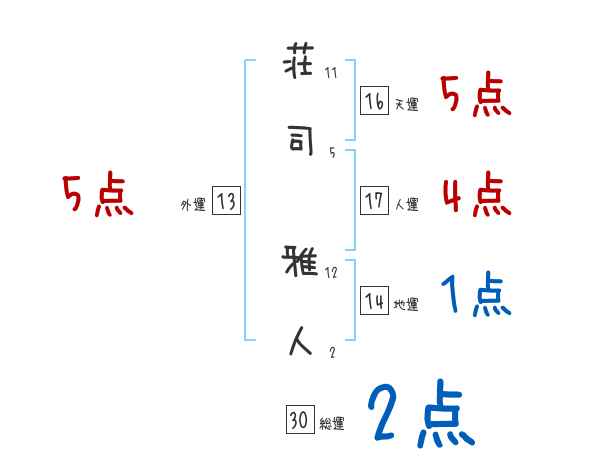 天運![]() | 荘司雅人さんの天運は16画の5つ星!人望が厚く大きく発展する。逆転成功が見える。 家系が持つ宿命的な運勢を表します。祖先から受け継いだ苗字ですので自分の力が及びません。家柄を象徴します。 |