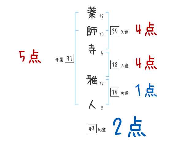 天運![]() | 薬師寺雅人さんの天運は35画の4つ星!温厚な性格で感受性が高い。穏和な性格で人望が厚い。 家系が持つ宿命的な運勢を表します。祖先から受け継いだ苗字ですので自分の力が及びません。家柄を象徴します。 |