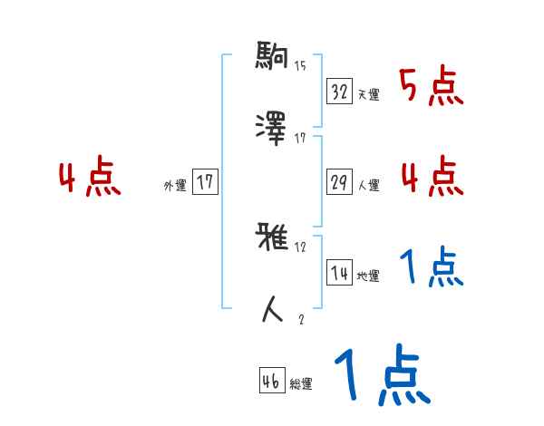 天運![]() | 駒澤雅人さんの天運は32画の5つ星!柔軟性があり成功する。チャンスが多く金運が良い。 家系が持つ宿命的な運勢を表します。祖先から受け継いだ苗字ですので自分の力が及びません。家柄を象徴します。 |