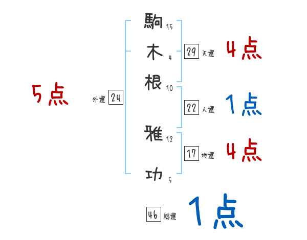 総運![]() | 駒木根雅功さんの総運は46画の1つ星!迷走することが多く苦労するかも。目先のことにとらわれないように。 あなたの人生を表す1番重要な運勢です。生涯を通じて影響する総合運となり、主に50歳以降の晩年期に影響を及ぼします。 |