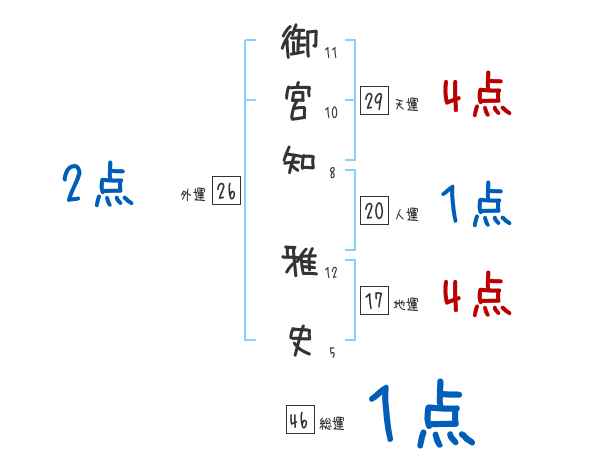 天運![]() | 御宮知雅史さんの天運は29画の4つ星!完全主義で才能がある。厳格な心の持ち主。 家系が持つ宿命的な運勢を表します。祖先から受け継いだ苗字ですので自分の力が及びません。家柄を象徴します。 |