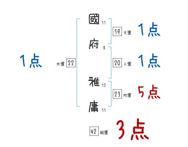 天運![]() | 國府雅庸さんの天運は19画の1つ星!優れた才能を持ちますが、協調性が足りないことも。周りの人と協力する事を意識しましょう。 家系が持つ宿命的な運勢を表します。祖先から受け継いだ苗字ですので自分の力が及びません。家柄を象徴します。 |
