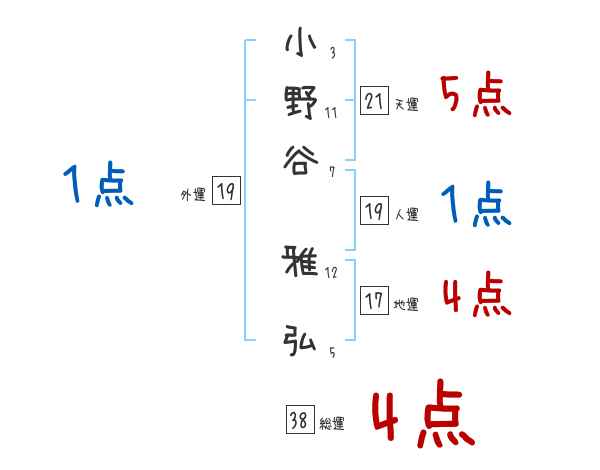 天運![]() | 小野谷雅弘さんの天運は21画の5つ星!統率力がある。独立し成功する。名誉を手に入れる。 家系が持つ宿命的な運勢を表します。祖先から受け継いだ苗字ですので自分の力が及びません。家柄を象徴します。 |