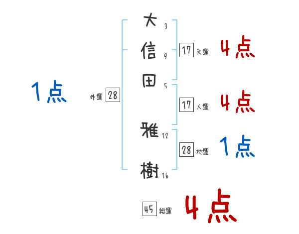 天運![]() | 大信田雅樹さんの天運は17画の4つ星!積極的な行動力。地位を気づき財産を手に入れる。純粋な心と直感力。 家系が持つ宿命的な運勢を表します。祖先から受け継いだ苗字ですので自分の力が及びません。家柄を象徴します。 |