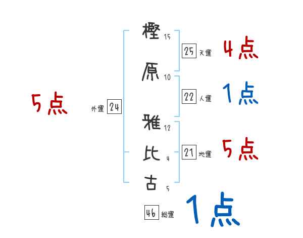外運![]() | 樫原雅比古さんの外運は24画の5つ星!家庭運が良く順調な人生。金運にも恵まれる。 生活面を象徴する運勢です。外部から受ける影響力を表し、結婚運、家庭運や職場、環境への順応性を表します。 |