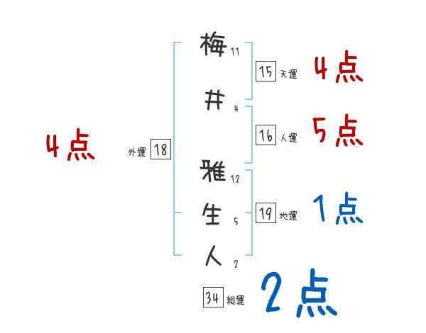 人運![]() | 梅井雅生人さんの人運は16画の5つ星!人望が厚く大きく発展する。逆転成功が見える。 性格や才能などを表す2番目に重要な運勢です。人間関係や協調性、社会的な成功に影響します。主に20歳から50歳ぐらいまでの中年期の運勢を表します。 |