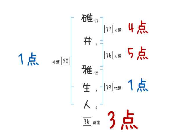 天運![]() | 碓井雅生人さんの天運は17画の4つ星!積極的な行動力。地位を気づき財産を手に入れる。純粋な心と直感力。 家系が持つ宿命的な運勢を表します。祖先から受け継いだ苗字ですので自分の力が及びません。家柄を象徴します。 |