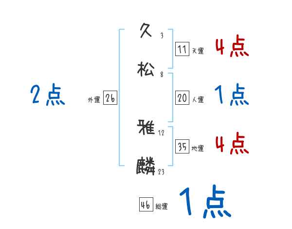天運![]() | 久松雅麟さんの天運は11画の4つ星!着実に富や地位を得る幸運な人生。 家系が持つ宿命的な運勢を表します。祖先から受け継いだ苗字ですので自分の力が及びません。家柄を象徴します。 |
