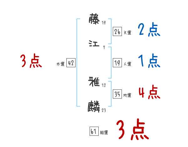 外運![]() | 藤江雅麟さんの外運は42画の3つ星!病気に注意。多芸であるが消極的でおとなしい。 生活面を象徴する運勢です。外部から受ける影響力を表し、結婚運、家庭運や職場、環境への順応性を表します。 |