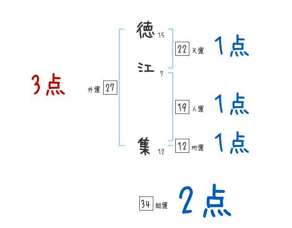 総運![]() | 徳江集さんの総運は34画の2つ星!独創性に優れるが、自尊心が強く災難に注意しましょう。 あなたの人生を表す1番重要な運勢です。生涯を通じて影響する総合運となり、主に50歳以降の晩年期に影響を及ぼします。 |