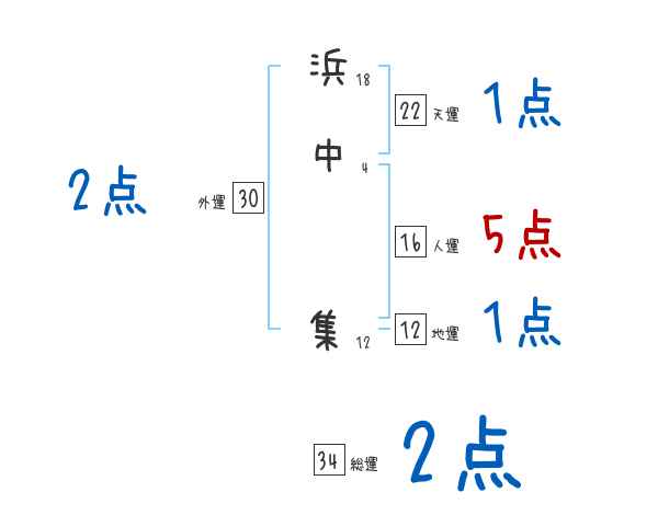 総運![]() | 浜中集さんの総運は34画の2つ星!独創性に優れるが、自尊心が強く災難に注意しましょう。 あなたの人生を表す1番重要な運勢です。生涯を通じて影響する総合運となり、主に50歳以降の晩年期に影響を及ぼします。 |