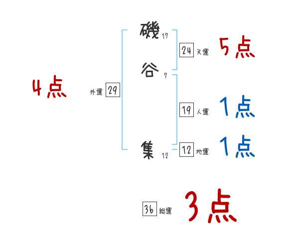 総運![]() | 磯谷集さんの総運は36画の3つ星!先見性が豊かです。多少神経質で苦労することも。 あなたの人生を表す1番重要な運勢です。生涯を通じて影響する総合運となり、主に50歳以降の晩年期に影響を及ぼします。 |