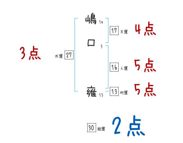 天運![]() | 嶋口雍さんの天運は17画の4つ星!積極的な行動力。地位を気づき財産を手に入れる。純粋な心と直感力。 家系が持つ宿命的な運勢を表します。祖先から受け継いだ苗字ですので自分の力が及びません。家柄を象徴します。 |