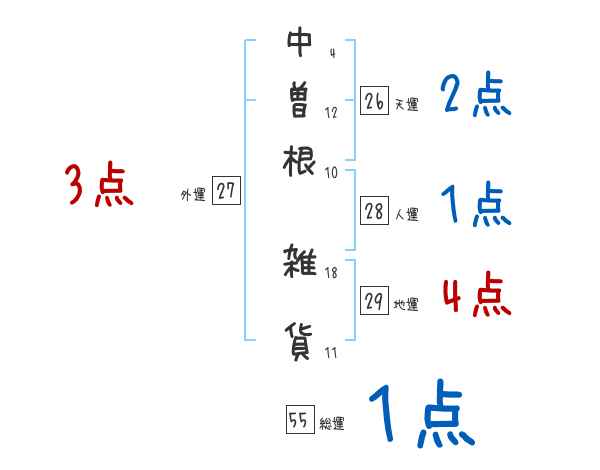 外運![]() | 中曽根雑貨さんの外運は27画の3つ星!頭脳明晰だが強情で摩擦が多い傾向。孤立に注意。 生活面を象徴する運勢です。外部から受ける影響力を表し、結婚運、家庭運や職場、環境への順応性を表します。 |