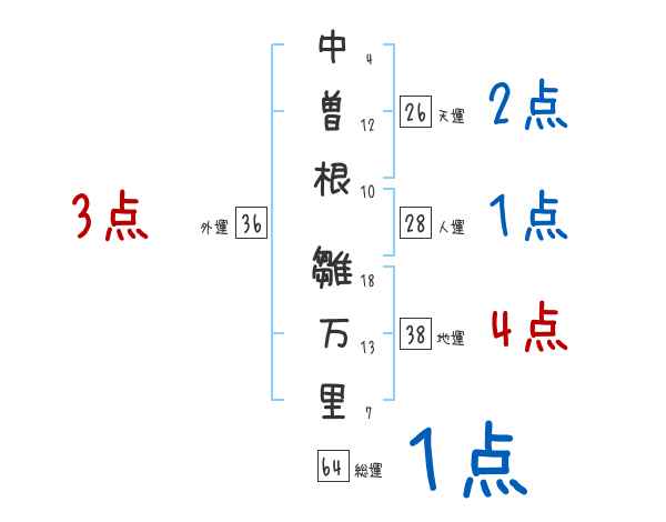外運![]() | 中曽根雛万里さんの外運は36画の3つ星!先見性が豊かです。多少神経質で苦労することも。 生活面を象徴する運勢です。外部から受ける影響力を表し、結婚運、家庭運や職場、環境への順応性を表します。 |