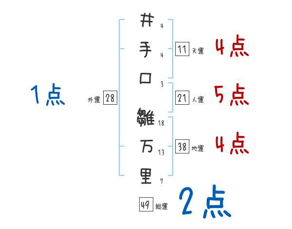 総運![]() | 井手口雛万里さんの総運は49画の2つ星!不安定な性格で明暗がある人生。周りの人には支援されやすい。 あなたの人生を表す1番重要な運勢です。生涯を通じて影響する総合運となり、主に50歳以降の晩年期に影響を及ぼします。 |