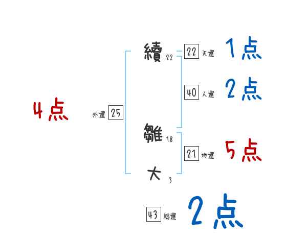天運![]() | 續雛大さんの天運は22画の1つ星!努力することが苦手ないっぽう手先が器用。芸術性にも優れる。 家系が持つ宿命的な運勢を表します。祖先から受け継いだ苗字ですので自分の力が及びません。家柄を象徴します。 |