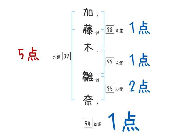 外運![]() | 加藤木雛奈さんの外運は32画の5つ星!柔軟性があり成功する。チャンスが多く金運が良い。 生活面を象徴する運勢です。外部から受ける影響力を表し、結婚運、家庭運や職場、環境への順応性を表します。 |