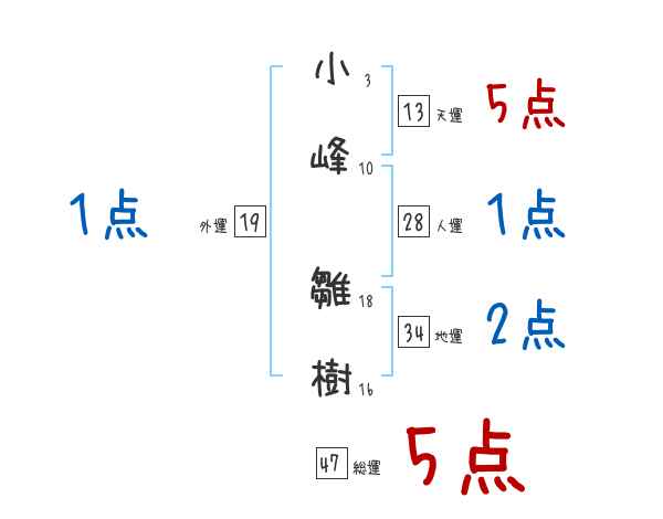 天運![]() | 小峰雛樹さんの天運は13画の5つ星!才能に恵まれ人気がある。名声を手に入れる。円満な人生。 家系が持つ宿命的な運勢を表します。祖先から受け継いだ苗字ですので自分の力が及びません。家柄を象徴します。 |