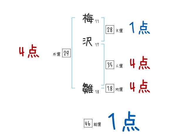 総運![]() | 梅沢雛さんの総運は46画の1つ星!迷走することが多く苦労するかも。目先のことにとらわれないように。 あなたの人生を表す1番重要な運勢です。生涯を通じて影響する総合運となり、主に50歳以降の晩年期に影響を及ぼします。 |