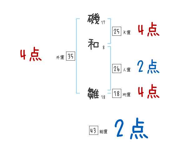 外運![]() | 磯和雛さんの外運は35画の4つ星!温厚な性格で感受性が高い。穏和な性格で人望が厚い。 生活面を象徴する運勢です。外部から受ける影響力を表し、結婚運、家庭運や職場、環境への順応性を表します。 |