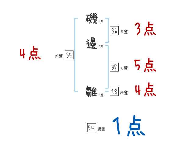 外運![]() | 磯邊雛さんの外運は35画の4つ星!温厚な性格で感受性が高い。穏和な性格で人望が厚い。 生活面を象徴する運勢です。外部から受ける影響力を表し、結婚運、家庭運や職場、環境への順応性を表します。 |