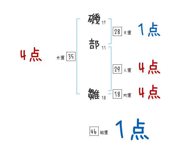 人運![]() | 磯部雛さんの人運は29画の4つ星!完全主義で才能がある。厳格な心の持ち主。 性格や才能などを表す2番目に重要な運勢です。人間関係や協調性、社会的な成功に影響します。主に20歳から50歳ぐらいまでの中年期の運勢を表します。 |