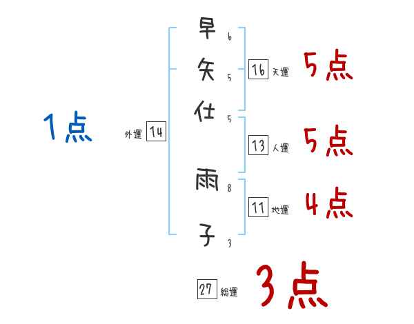 天運![]() | 早矢仕雨子さんの天運は16画の5つ星!人望が厚く大きく発展する。逆転成功が見える。 家系が持つ宿命的な運勢を表します。祖先から受け継いだ苗字ですので自分の力が及びません。家柄を象徴します。 |
