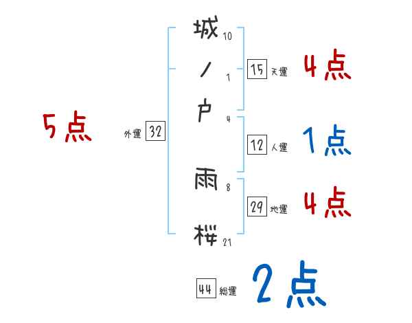 外運![]() | 城ノ戸雨桜さんの外運は32画の5つ星!柔軟性があり成功する。チャンスが多く金運が良い。 生活面を象徴する運勢です。外部から受ける影響力を表し、結婚運、家庭運や職場、環境への順応性を表します。 |