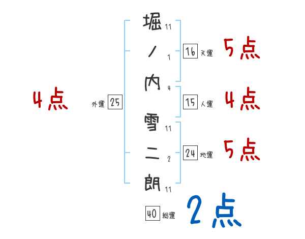 外運![]() | 堀ノ内雪二朗さんの外運は25画の4つ星!個性があり才能があふれる。強運の持ち主で発展する。 生活面を象徴する運勢です。外部から受ける影響力を表し、結婚運、家庭運や職場、環境への順応性を表します。 |