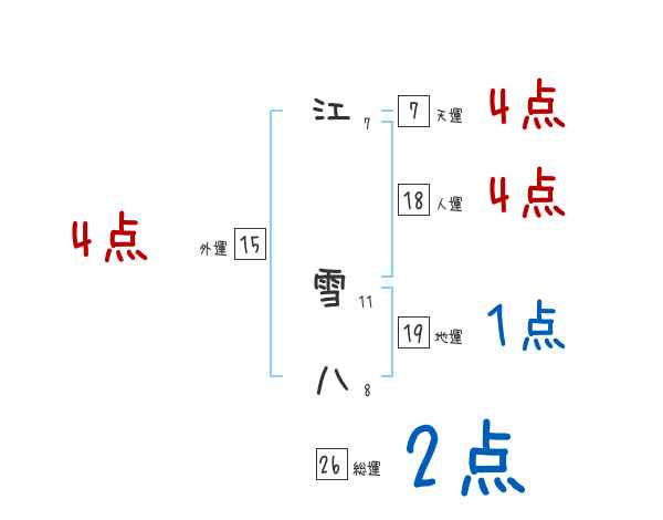 天運![]() | 江雪八さんの天運は7画の4つ星!強い意志や信念を持ち独立心が強い。自立する。 家系が持つ宿命的な運勢を表します。祖先から受け継いだ苗字ですので自分の力が及びません。家柄を象徴します。 |