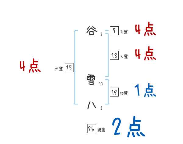 天運![]() | 谷雪八さんの天運は7画の4つ星!強い意志や信念を持ち独立心が強い。自立する。 家系が持つ宿命的な運勢を表します。祖先から受け継いだ苗字ですので自分の力が及びません。家柄を象徴します。 |