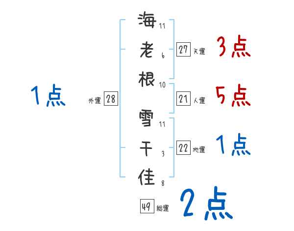 外運![]() | 海老根雪千佳さんの外運は28画の1つ星!家庭環境に注意。スポーツで活躍できる能力があるかも。 生活面を象徴する運勢です。外部から受ける影響力を表し、結婚運、家庭運や職場、環境への順応性を表します。 |