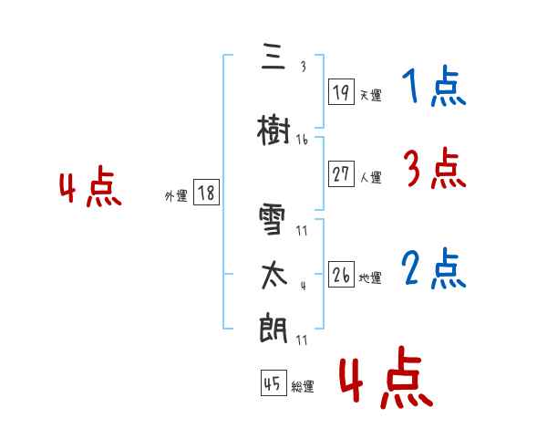 地運![]() | 三樹雪太朗さんの地運は26画の2つ星!波瀾万丈かも。信頼できる人を大事にしましょう。 個性を表す基礎的な運勢です。性格形成や対人関係、行動力など家庭環境に影響されます。主に誕生してから20歳くらいまでの若年期の運勢を表します。 |