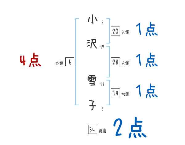 総運![]() | 小沢雪子さんの総運は34画の2つ星!独創性に優れるが、自尊心が強く災難に注意しましょう。 あなたの人生を表す1番重要な運勢です。生涯を通じて影響する総合運となり、主に50歳以降の晩年期に影響を及ぼします。 |