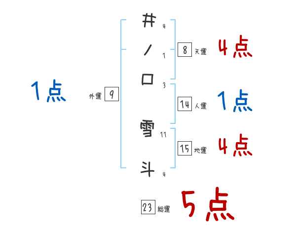 総運![]() | 井ノ口雪斗さんの総運は23画の5つ星!想像力に優れ活力がある。一代で成功し名誉を手に入れる。 あなたの人生を表す1番重要な運勢です。生涯を通じて影響する総合運となり、主に50歳以降の晩年期に影響を及ぼします。 |