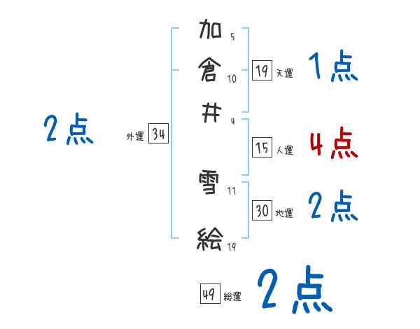 総運![]() | 加倉井雪絵さんの総運は49画の2つ星!不安定な性格で明暗がある人生。周りの人には支援されやすい。 あなたの人生を表す1番重要な運勢です。生涯を通じて影響する総合運となり、主に50歳以降の晩年期に影響を及ぼします。 |