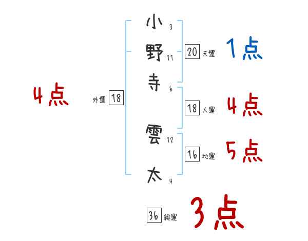 外運![]() | 小野寺雲太さんの外運は18画の4つ星!情熱的で剛気。忍耐力があり信頼される。 生活面を象徴する運勢です。外部から受ける影響力を表し、結婚運、家庭運や職場、環境への順応性を表します。 |