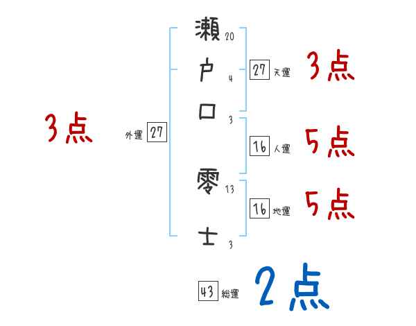 総運![]() | 瀬戸口零士さんの総運は43画の2つ星!頑固な性格で独立心が強いかも。やや非現実的で浪費に注意しましょう。 あなたの人生を表す1番重要な運勢です。生涯を通じて影響する総合運となり、主に50歳以降の晩年期に影響を及ぼします。 |