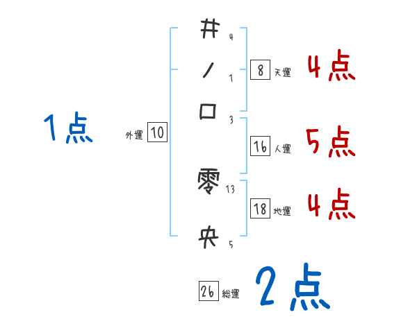 人運![]() | 井ノ口零央さんの人運は16画の5つ星!人望が厚く大きく発展する。逆転成功が見える。 性格や才能などを表す2番目に重要な運勢です。人間関係や協調性、社会的な成功に影響します。主に20歳から50歳ぐらいまでの中年期の運勢を表します。 |